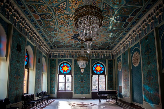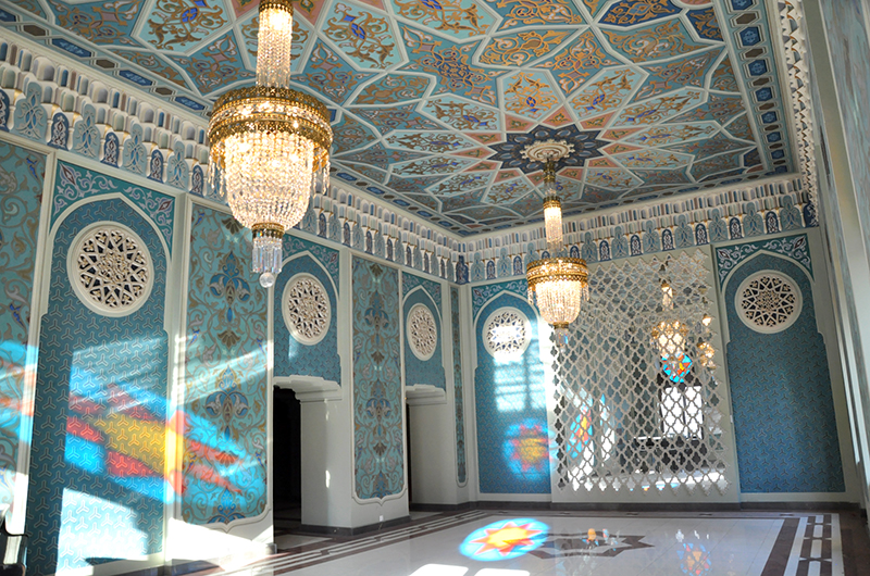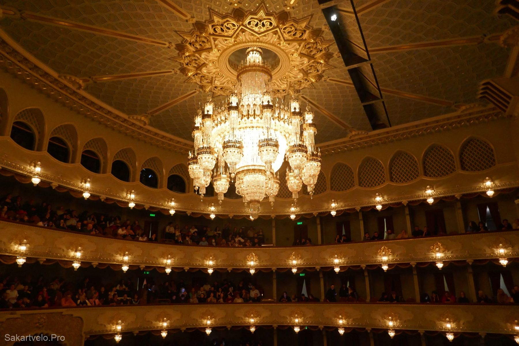 თეატრის ინტერიერი არანაკლებ შთამბეჭდავია. დიდი თეატრის დარბაზი, რომელიც 1200 ადამიანზე მეტს იტევს, აღჭურვილია უახლესი ხმის და განათების სისტემებით. ჭერი ცნობილი მხატვრის იოსებ ნადირაძის მიერ იქნა მოხატული, რაც დასახლებულ სივრცეს განსაკუთრებულ მშვენიერებას სძენს.